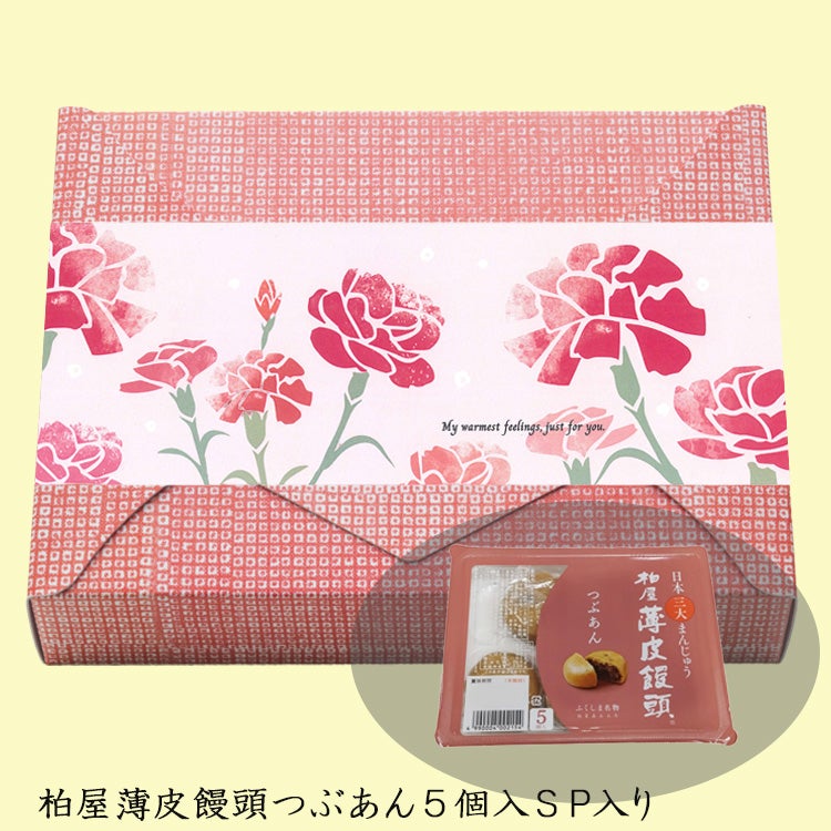 かわいらしい鹿の子の箱に、柏屋薄皮饅頭つぶあん5個入をお入れし、母の日にあった掛け紙をおかけしました。