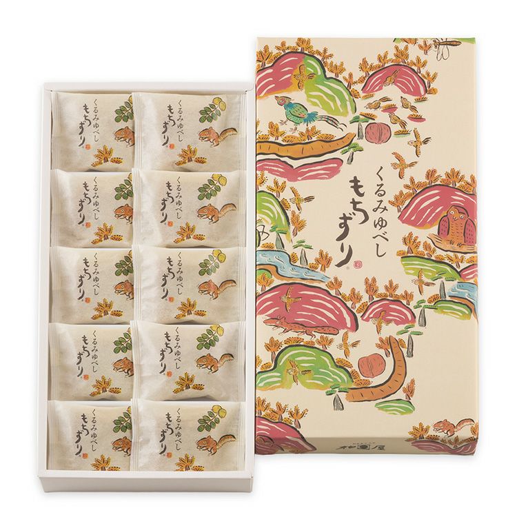 もちずりは、豊かな風土で育まれたお米と香ばしいくるみを練り合わせ蒸し上げました。くるみの量2倍(当社比)にリニューアル。もちもち、しっとり、ますますおいしくなりました。